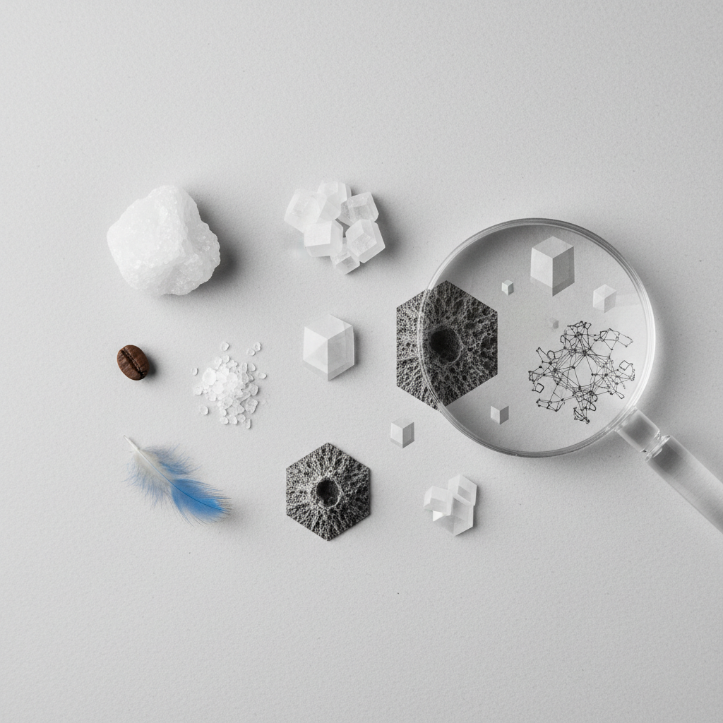 Hvis man tager en tur i køkkenet med et mikroskop, vil man opdage, at vi spiser krystaller hver dag. Bbåde salt og sukker ser ens ud for det blotte øje – som hvidt pulver eller små korn. Men tæt på afslører de deres sande kemiske identitet: